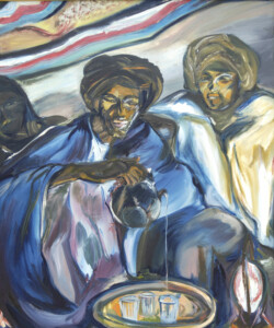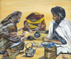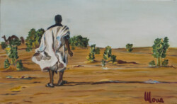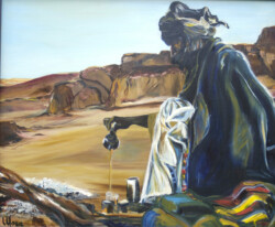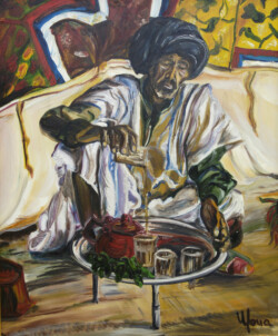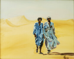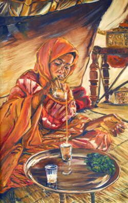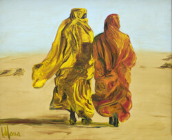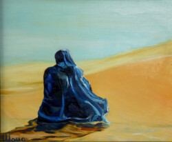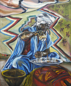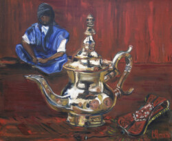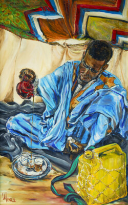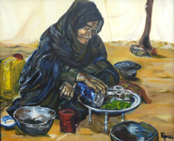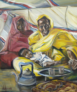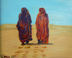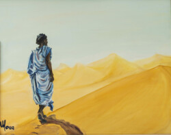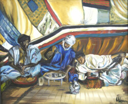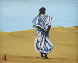 Désert de sable modelé au gré des vents en dunes aux ocres nuancés où la moindre touche colorée accroche le regard… luminosité vive et contrastée sous l’ombre de la Khaïma, silhouettes indigo et blanches des boubous amples et flottants sans cesse réajustés, silhouettes colorées des femmes sous les drapés souples qui protègent et ventilent les corps.